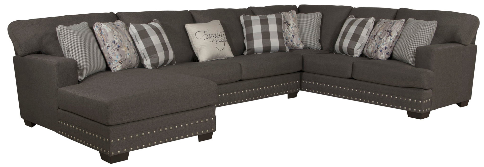 The contemporary farmhouse styling of the Crawford sectional brings comfort and style to any room. The seats are constructed of individually pocketed coils encased in foam and topped with a layer of cool gel infused memory foam for a long lasting, comfortable and supportive seat. Covered in a soft durable 100% polyester fabric the Crawford is durable enough for use in a family room, basement or bonus room. The exceptional styling shows through with the included decorator accent pillows and nickel nail head accents along the base rail.