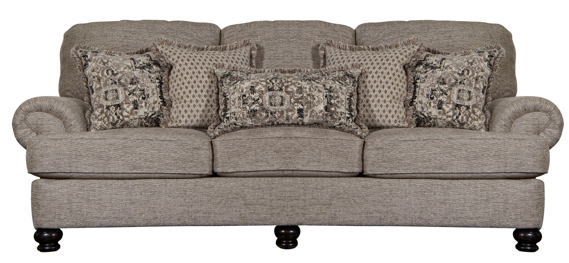 FREEMONT is a big, deep Traditional rolled arm design with wooden legs and correlating toss pillows in decorative fringe.