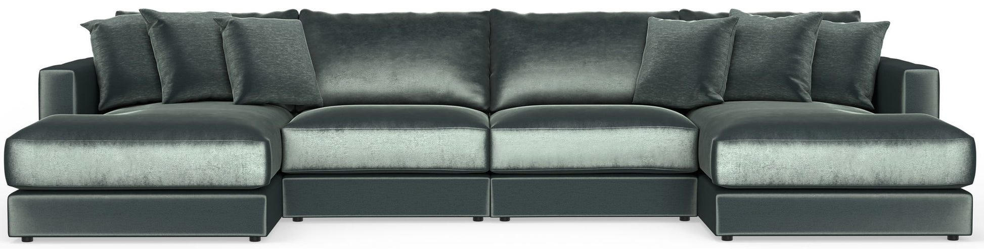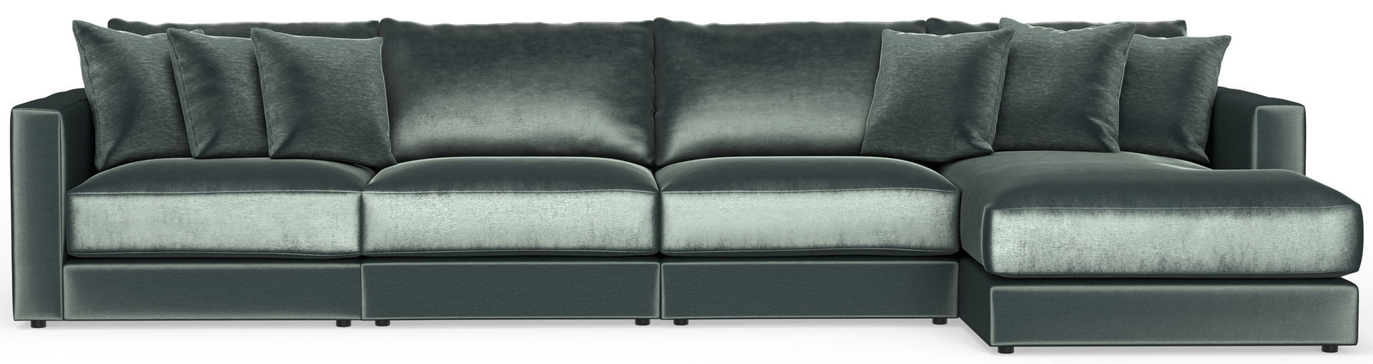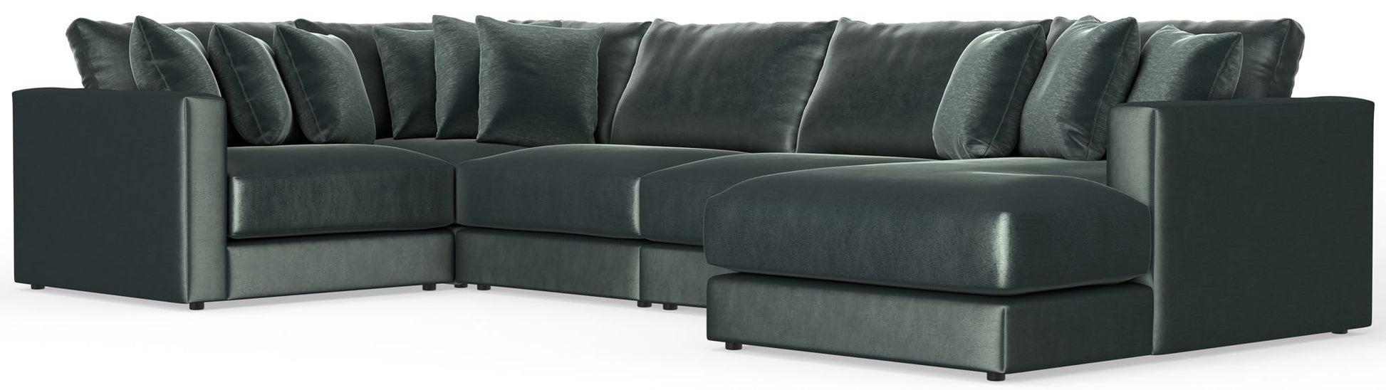 Remington is a track arm design Modular Sectional with loose backs and our Cuddler Cushion for ultimate comfort. Available in your choice of two luxurious velvet fabric colors: Pine or Slate.